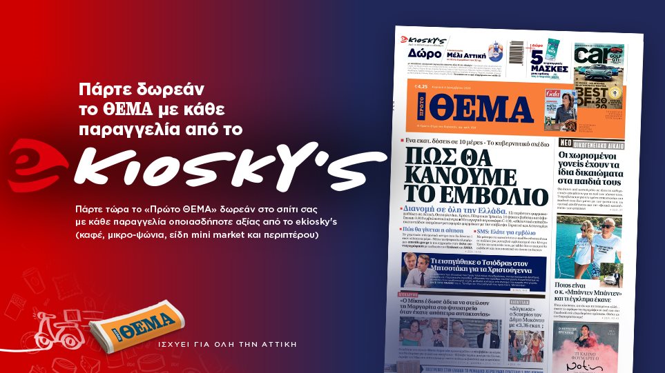 Το «Πρώτο ΘΕΜΑ» έρχεται σπίτι σας δωρεάν με το ekiosky’s! Τώρα, με ό,τι παραγγελία κι αν κάνετε (εκτός από είδη καπνού) μέσα από την ιστοσελίδα του ekiosky’s, το «Πρώτο ΘΕΜΑ» έρχεται άμεσα όπου κι αν βρίσκεστε, μέσα σε λίγα λεπτά. Η προσφορά ισχύει για όλη την Αττική.