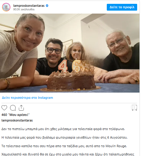 Το μεσημέρι της Κυριακής 24 Αυγούστου, ο Λάμπρος Κωνσταντάρας αποχαιρέτησε τον πατέρα του μέσα από μία ανάρτηση στα social media.