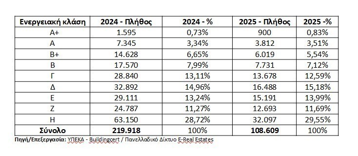Την ίδια στιγμή, οι χαμηλότερες ενεργειακές κλάσεις Ε, Ζ και Η συγκεντρώνουν το 53,25% των κατοικιών το 2024 και το 55,23% το 2025, γεγονός που σημαίνει ότι περισσότερες από 5 στις 10 κατοικίες εντάσσονται στις ενεργειακά πιο επιβαρυμένες κατηγορίες. Η διαπίστωση αυτή συνδέεται άμεσα με συνθήκες αυξημένου κόστους λειτουργίας και ενεργειακής φτώχειας για μεγάλο μέρος των νοικοκυριών.