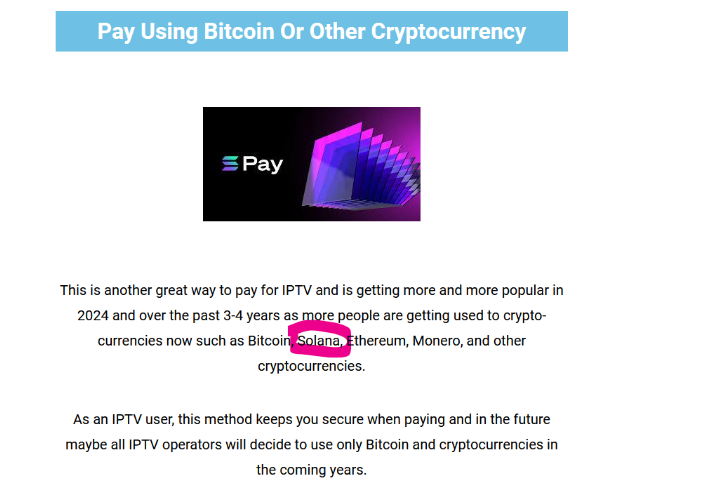 Το ίδιο κρυπτονόμισμα έχει εντοπιστεί και σε μεγάλα πειρατικά δίκτυα συνδρομητικής τηλεόρασης, όπου οι χρήστες παραπλανώνται ή εν αγνοία τους εμπλέκονται σε ύποπτες συναλλαγές, αφού πολλοί πειρατές έχουν μεθόδους πληρωμών τέτοια κρυπτονομίσματα.