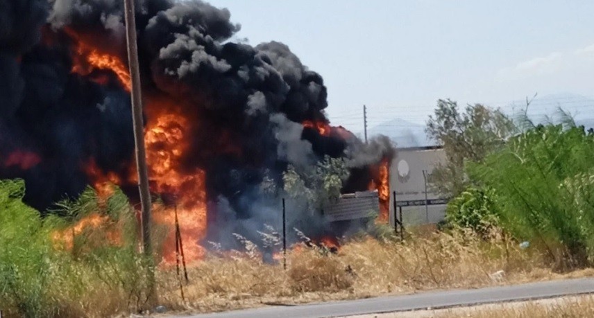 Οι φλόγες καίνε σε δύο φορτηγά οχήματα εντός της μάντρας, ενώ υπάρχουν αναφορές για εκρήξεις.