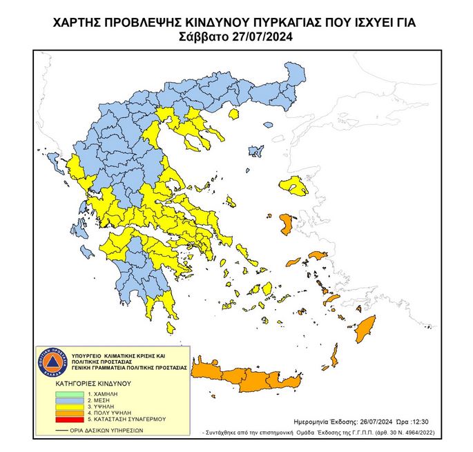 Πολύ υψηλός κίνδυνος πυρκαγιάς (κατηγορία κινδύνου 4) προβλέπεται αύριο στην περιφέρεια Κρήτης και σε περιοχές των περιφερειών Βορείου και Νοτίου Αιγαίου, σύμφωνα με το Χάρτη Πρόβλεψης Κινδύνου Πυρκαγιάς που εκδίδει η γενική γραμματεία Πολιτικής Προστασίας του υπουργείου Κλιματικής Κρίσης & Πολιτικής Προστασίας .