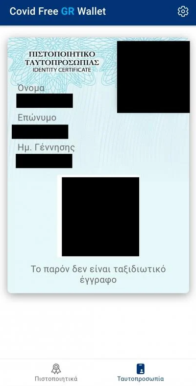 Αφού ολοκληρώσετε και αυτό το βήμα, η ψηφιακή ταυτότητά σας έχει «ανέβει» στην εφαρμογή στην παρακάτω μορφή. Πλέον εκτός του πιστοποιητικού, θα μπορείτε να δείχνετε και την ταυτότητά σας μέσω της εφαρμογής.