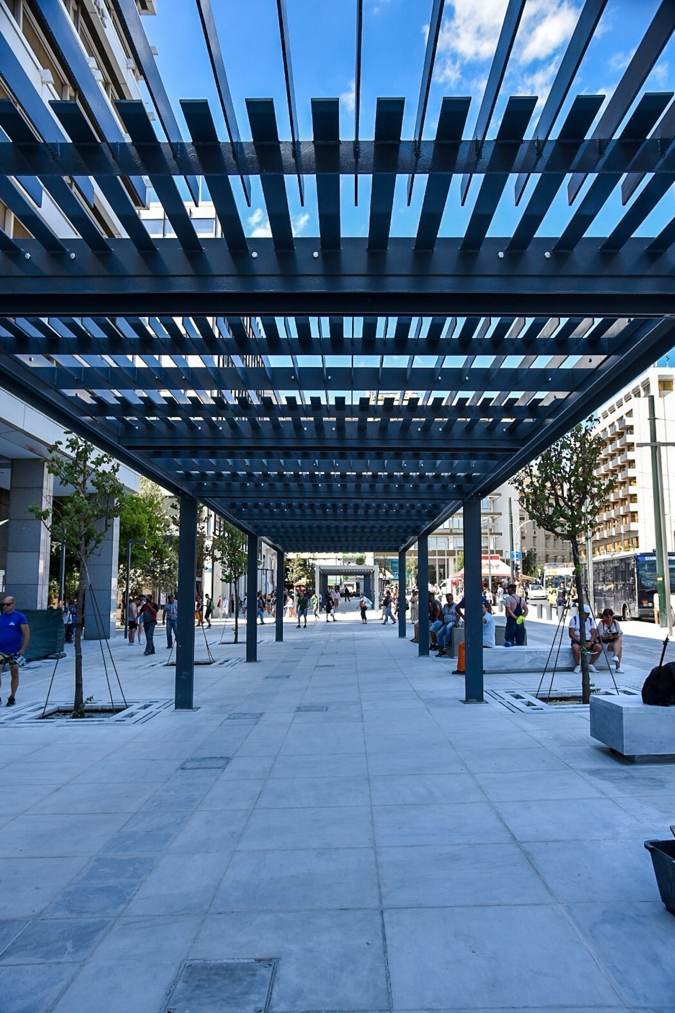 Επίσης, στο πλαίσιο του έργου, κατασκευάστηκαν δύο διαμήκεις πέργκολες ανάμεσα στα δέντρα, συνολικής επιφάνειας 262 τ.μ., για πρόσθετη σκίαση και οργάνωση των τραπεζοκαθισμάτων.