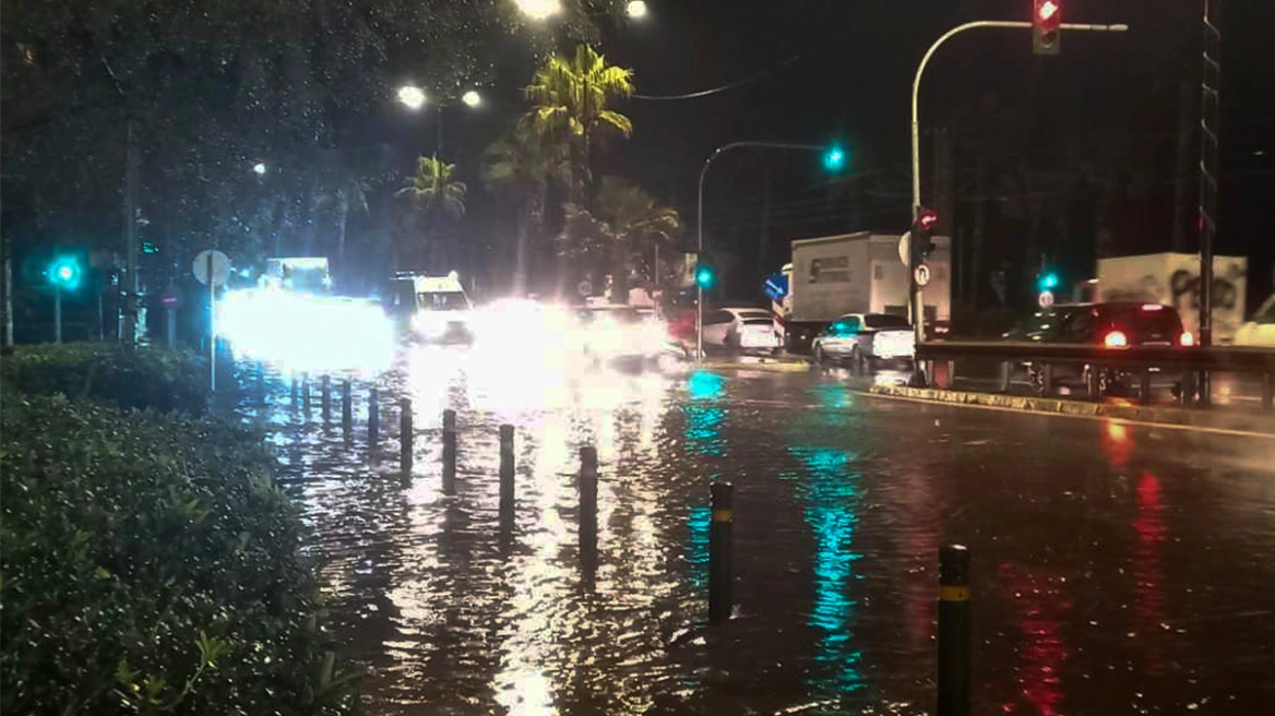 Από την ισχυρή βροχή, οι δρόμοι μετατράπηκαν σε ποτάμια με αποτέλεσμα, η αστυνομία να κλείσει τις δύο από τις τρεις λωρίδες στη Ποσειδώνος στο ρεύμα προς Πειραιά.