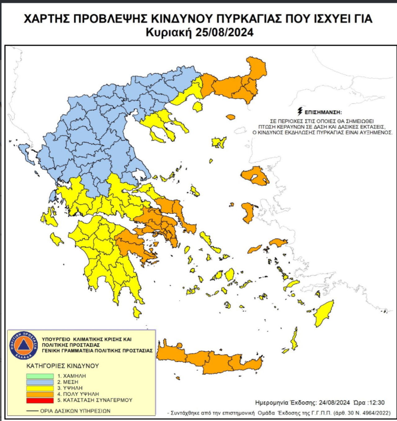 Πολύ υψηλός κίνδυνος πυρκαγιάς (κατηγορία κινδύνου 4) προβλέπεται αύριο Κυριακή 25/8 σε περιφέρεια Αττικής, Κρήτης καθώς και σε περιοχές της Στερεάς Ελλάδας, Πελοποννήσου, Βορείου Αιγαίου, Ανατολικής Μακεδονίας και Θράκης, σύμφωνα με το Χάρτη Πρόβλεψης Κινδύνου Πυρκαγιάς που εκδίδει η γενική γραμματεία Πολιτικής Προστασίας του υπουργείου Κλιματικής Κρίσης και Πολιτικής Προστασίας.