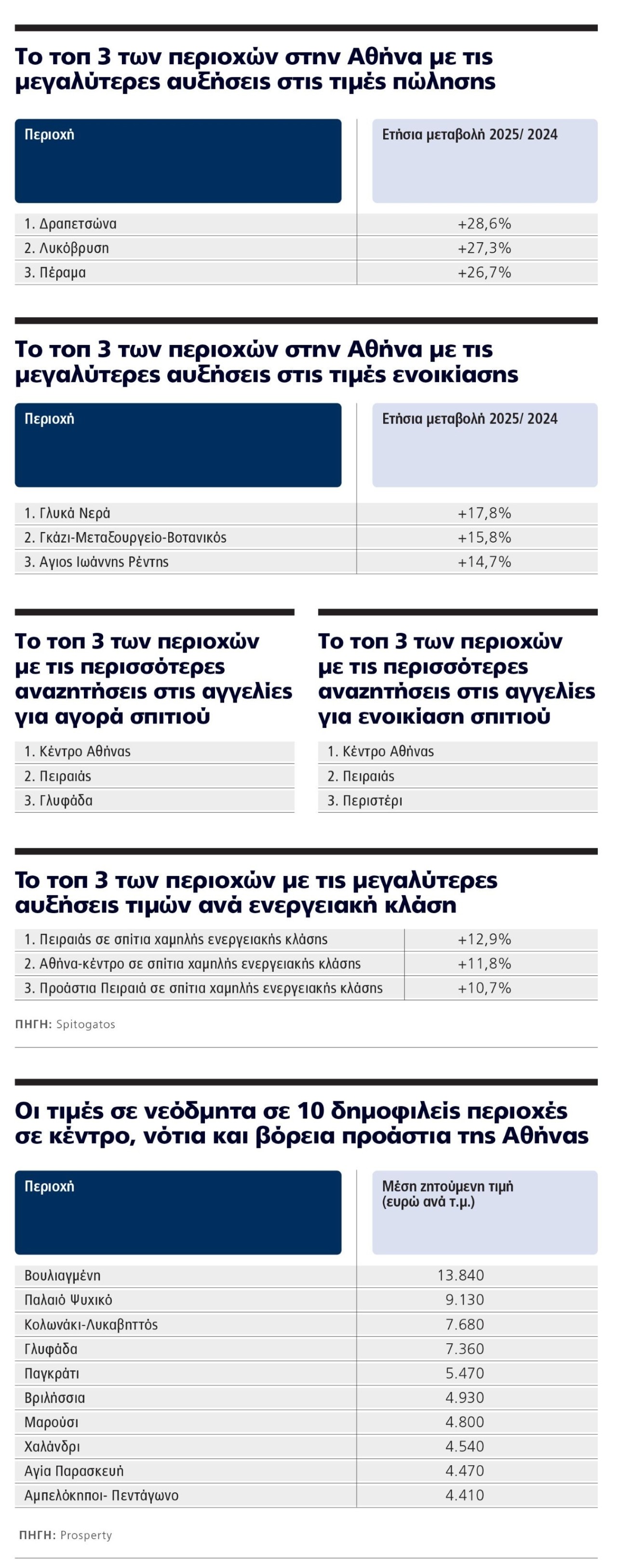 Πρώτη μεγάλη αλλαγή είναι η εκτόξευση του Πειραιά στη δεύτερη θέση των αναζητήσεων για αγορά σπιτιού από την 7η, το 2022, και αντίστοιχα η νέα είσοδος του Περιστερίου στην 6η θέση της κατάταξης, που σε όλη τη διάρκεια των προηγούμενων ετών ήταν εκτός δεκάδας. Μετά τον Δήμο Αθηναίων και τον Πειραιά, τη δεκάδα των πιο δημοφιλών περιοχών απαρτίζουν η Γλυφάδα, το Χαλάνδρι, η Κηφισιά, το Μαρούσι, το Παλαιό Φάληρο, η Νέα Σμύρνη και η Καλλιθέα. Το αντίστοιχο συμβαίνει και στις ενοικιάσεις, όπου μετά το «δίδυμο» του κέντρου της Αθήνας και του Πειραιά στις δύο πρώτες θέσεις, ακολουθεί τρίτο σε αναζητήσεις το Περιστέρι και έπονται Χαλάνδρι, Καλλιθέα, Γλυφάδα, Μαρούσι, Αιγάλεω, Νέα Σμύρνη και Νέα Ιωνία.