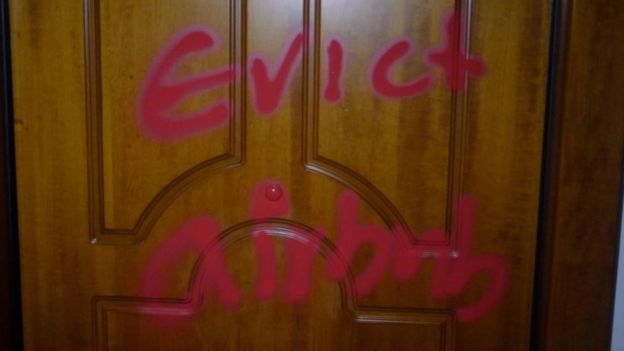Το γράφιτι στην πόρτα είναι σαφές: «Κάντε έξωση στην Airbnb». Οσο για τις κλειδαριές στο κτήριο που νοικιάζει διαμερίσματα στα Εξάρχεια, έχουν μπλοκαριστεί με καρφιά.