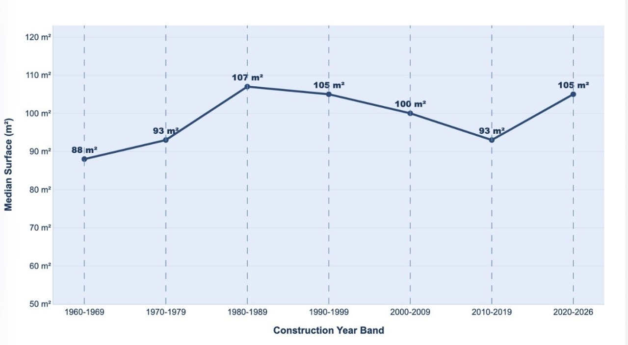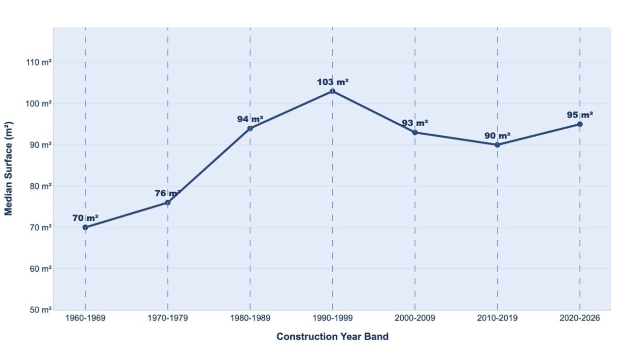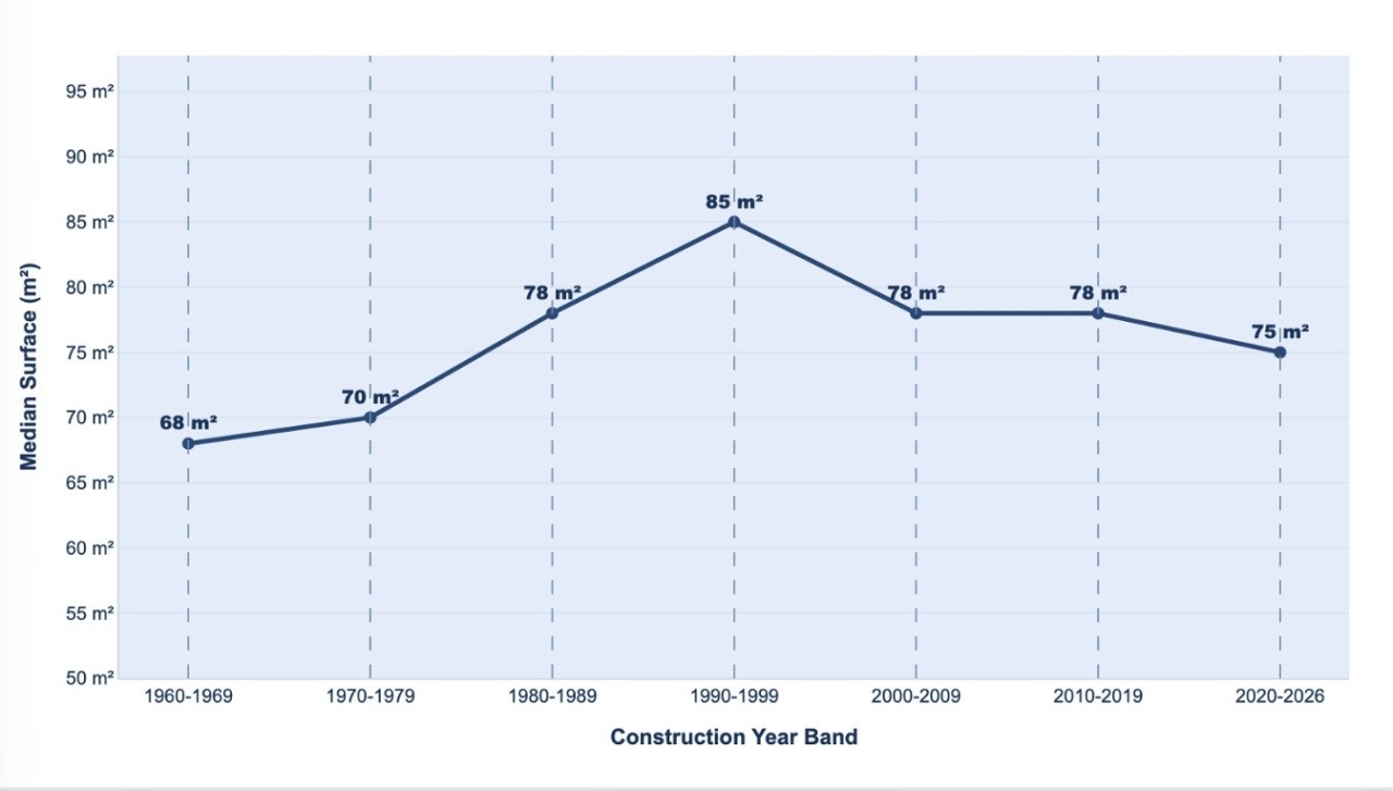 Στο κέντρο της Αθήνας τα διαμερίσματα έχουν μικρύνει πλέον στα 75 τ.μ. για τα διαμερίσματα κατασκευής 2020- 2026 όταν τη δεκαετία του ‘90 το αντίστοιχο νούμερο ήταν στα 85 τ.μ.. Η ανάλυση της ReDataset κάνει λόγο για σταδιακή και σταθερή συμπίεση του μεγέθους των διαμερισμάτων και όχι συγκυριακή μεταβολή.