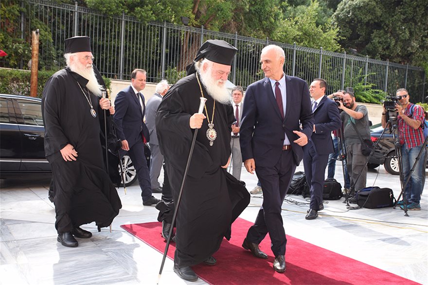 Ο Αρχιεπίσκοπος Ιερώνυμος φτάνει στη Βουλή και τον υποδέχεται ο α΄ αντιπρόεδρος της απερχόμενης Βουλής Γιώργος Βαρεμένος