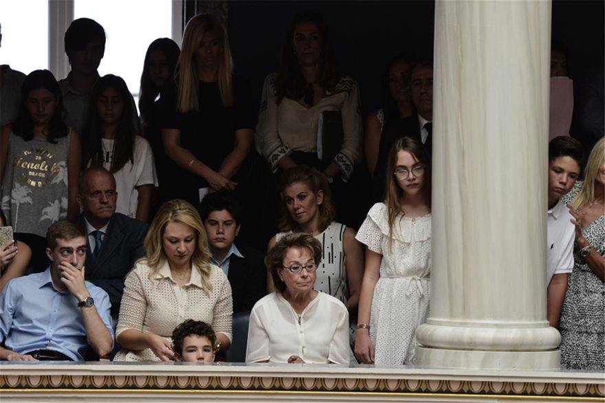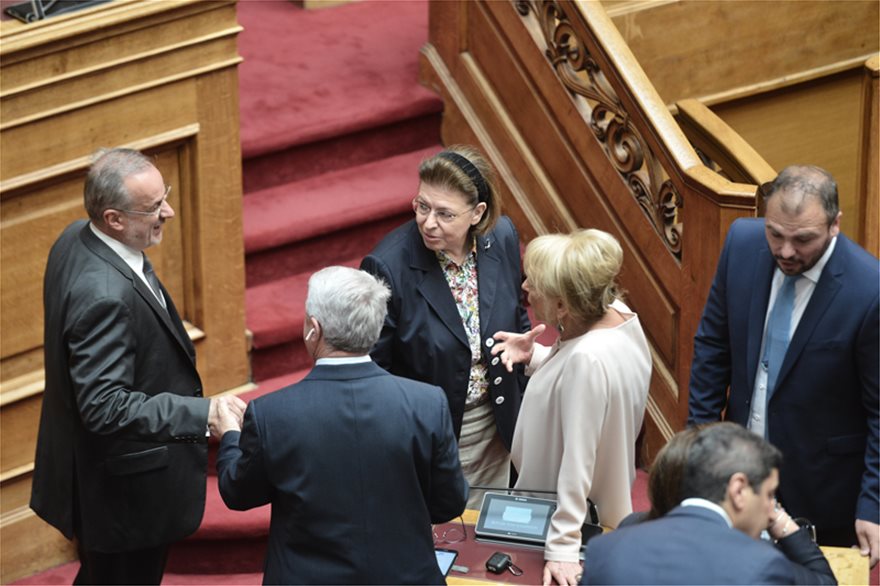 Στην πρώτη σειρά των εδράνων της ΝΔ κάθισε η Ντόρα Μπακογιάννη η οποία είχε θερμούς εναγκαλισμούς με βουλευτές του κόμματος αλλά έβγαλε και φωτογραφία με την Λιανά Κανέλλη του ΚΚΕ, η Μαριέττα Γιαννάκου, ο Γιάννης Τραγάκης, ο Θανάσης Μπούρας και ο νέος γραμματέας της ΚΟ Σταύρος Καλαφάτης.