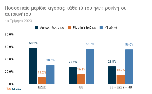 Από τις τρεις κατηγορίες ηλεκτροκίνησης, η πιο δημοφιλής παραμένει η υβριδική στην Ευρωπαϊκή Ένωση. Παρατηρείται όμως μια άνοδος της προτίμησης στα αμιγώς ηλεκτρικά αυτοκίνητα έναντι των Plug-In υβριδικών μοντέλων την περίοδο Ιανουαρίου-Μαρτίου του 2023 σε σχέση με την ίδια περίοδο του 2022.