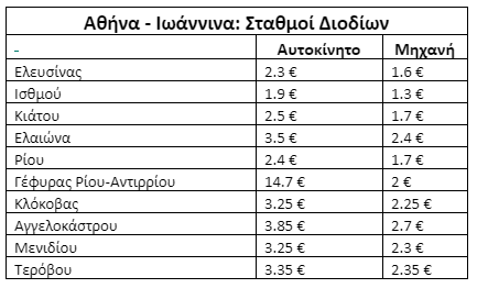 Το ταξίδι στα Ιωάννινα από το κέντρο της Αθήνας διαρκεί 4 ώρες και 15 λεπτά περίπου, ενώ το συνολικό κόστος της μίας διαδρομής ανέρχεται περίπου στα 100 ευρώ. Πιο αναλυτικά, το κόστος της βενζίνης εκτιμάται στα 60 ευρώ χονδρικά και τα διόδια στα 40.