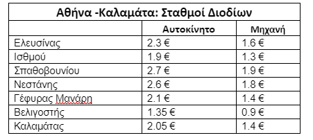 Το ταξίδι με το αυτοκίνητο για την πρωτεύουσα της Μεσσηνίας κοστίζει συνολικά 52 ευρώ, με τη βενζίνη να υπολογίζεται στα 37 ευρώ και τα διόδια 15 ευρώ.