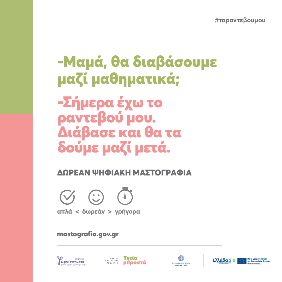 Στον αέρα βρίσκεται η νέα καμπάνια επικοινωνίας για το Πρόγραμμα Προληπτικής Μαστογραφίας «Φώφη Γεννηματά» που σχεδίασε και υλοποιεί η Choose Strategic Communications Partner για το Υπουργείο Υγείας.