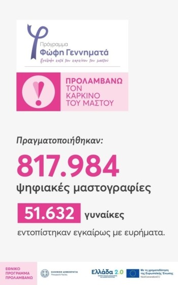 • Πρόγραμμα για την πρόληψη του καρκίνου του μαστού: Πραγματοποιήθηκαν ως τώρα, 817.984 ψηφιακές μαστογραφίες, με 51.632 γυναίκες να εντοπίζονται εγκαίρως με ευρήματα.