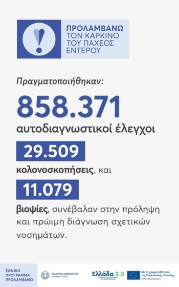 • Πρόγραμμα για την πρόληψη του καρκίνου του παχέος εντέρου: Πραγματοποιήθηκαν έως τώρα, 858.371 αυτοδιαγνωστικοί έλεγχοι, 29.509 κολονοσκοπήσεις, και 11.079 βιοψίες, συμβάλλοντας στην πρόληψη και πρώιμη διάγνωση σχετικών νοσημάτων.