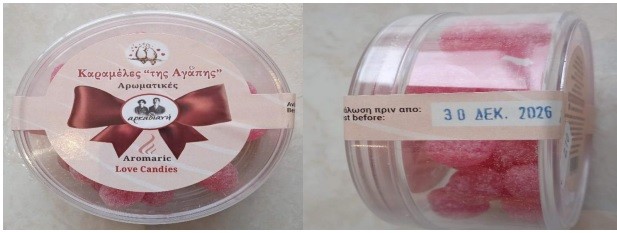 Καραμέλες «της Αγάπης-Αρωματικές» με ημερομηνία ανάλωσης πριν από τις 30 ΔΕΚ. 2026, συσκευασίας καθαρού βάρους περίπου 110g της εταιρείας με διακριτικό τίτλο «αρκαδιανή» που εδρεύει στο Ψάρι Αρκαδίας.