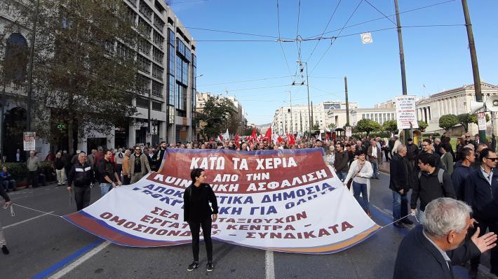 Με κεντρικό σύνθημα «Κάτω τα χέρια από την Κοινωνική Ασφάλιση» ολοκληρώθηκε το συλλαλητήριο εργαζομένων, αυτοαπασχολουμένων, συνταξιούχων στην Βουλή. Νωρίτερα η συγκέντρωση στα Προπύλαια άνοιξε με χαιρετισμό του Ολιβιέ Ματό, γγ του Εργατικού Κέντρου Μασσαλίας, ο οποίος εξέφρασε την ταξική αλληλεγγύη και τη στήριξη των εργαζομένων του νομού και της πόλης της Μασσαλίας.