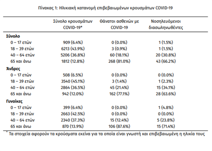 Οσον αφορά τις ηλικίες 18-39: Σύμφωνα με την έκθεση του ΕΟΔΥ έχουμε 6213 κρούσματα σε αυτή την ηλικιακή κατηγορία, που είναι και τα περισσότερα από οποιαδήποτε άλλη. Από αυτά 3.540 αφορούν άντρες και 2663 γυναίκες. Μεταξύ αυτής της ηλικιακής κατηγορίας υπάρχει μόνο ένας διασωληνωμένος άντρας. Στους 40-64 έχουμε 5206 κρούσματα και 20 διασωληνωμένους.