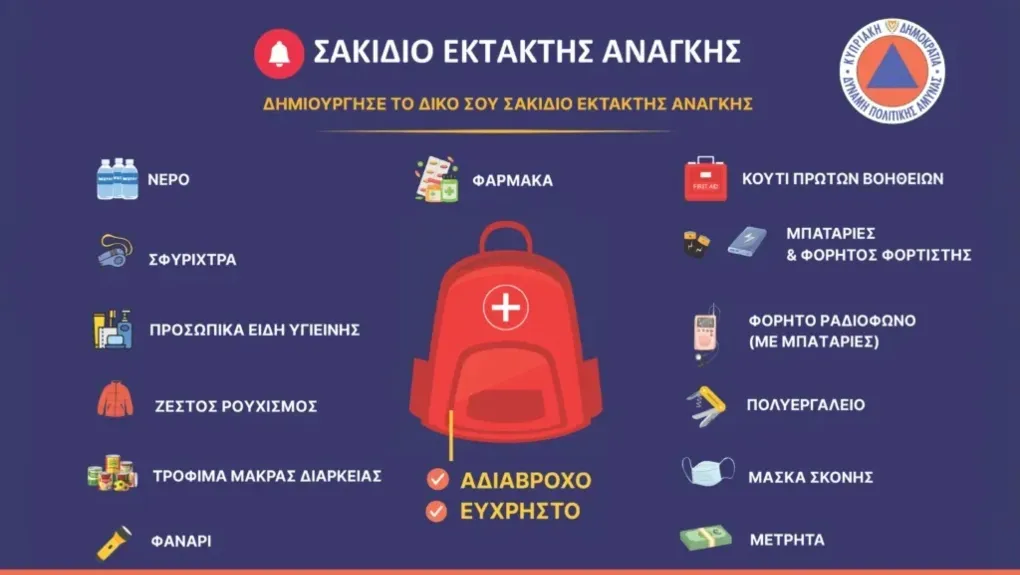 Άμεση έκκληση προς το κοινό για την οργάνωση ενός «Σακιδίου Επιβίωσης» στο πλαίσιο προληπτικών μέτρων εξέδωσε το κυπριακό Υπουργείο Εσωτερικών.