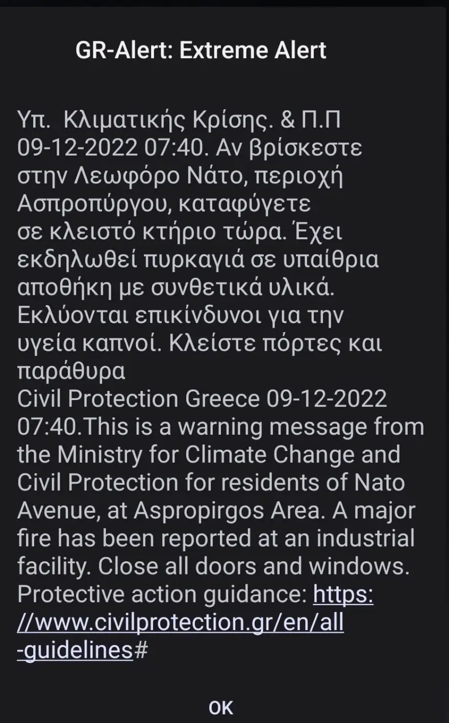 «Καταφύγετε σε κλειστό κτήριο τώρα. Έχει εκδηλωθεί πυρκαγιά σε υπαίθρια αποθήκη με συνθετικά υλικά. Εκλύονται επικίνδυνοι για την υγεία καπνοί. Κλείστε πόρτες και παράθυρα» αναφέρεται χαρακτηριστικά στο μήνυμα από το 112.