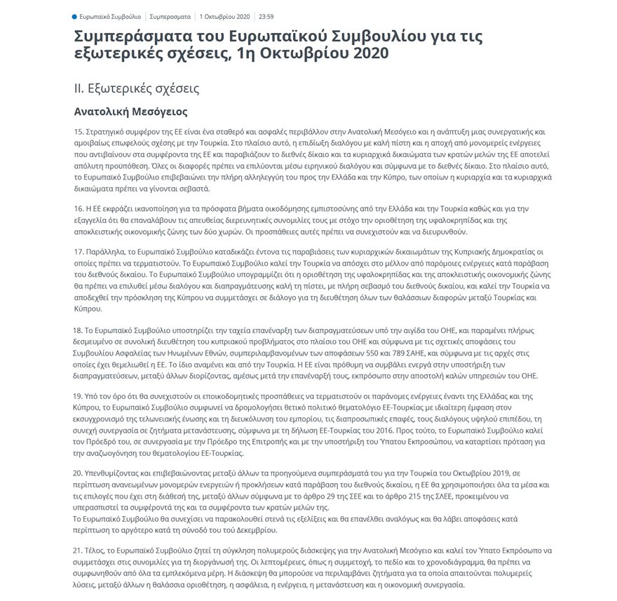 Επιπλέον, στο τελικό κείμενο των συμπερασμάτων καταδικάζονται απερίφραστα οι μονομερείς ενέργειες της Τουρκίας και είναι ξεκάθαρο ότι αν υπάρξει συνέχιση τέτοιων συμπεριφορών, αυτό θα έχει συνέπειες.
