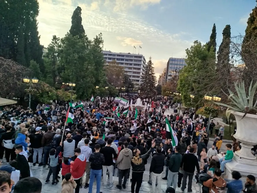 Νέοι άνθρωποι, γονείς με τα παιδιά τους και ηλικιωμένοι δηλώνουν συγκινημένοι για το τέλος όπως λένε της πολυετούς δικτατορίας Άσαντ. Η αστυνόμευση στην πλατεία Συντάγματος είναι διακριτική.