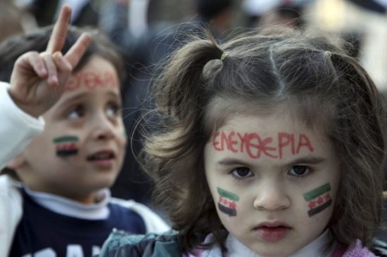 Πρόσφυγες από τη Συρία και άλλες χώρες σε εμπόλεμη κατάσταση, που βρίσκονται στην Ελλάδα ζητούν να μπει τέλος στον πόλεμο.