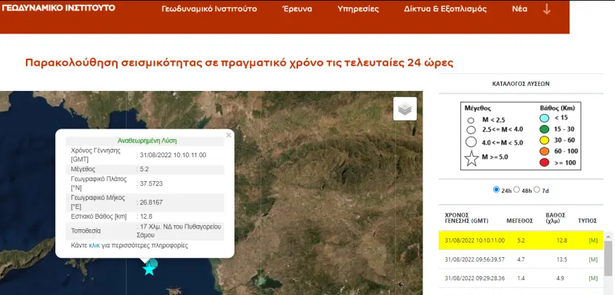 Δύο ισχυροί σεισμοί με διαφορά μόλις 14 λεπτών χτύπησαν τη Σάμο, με μεγέθη 4,7 και 5,2 Ρίχτερ.