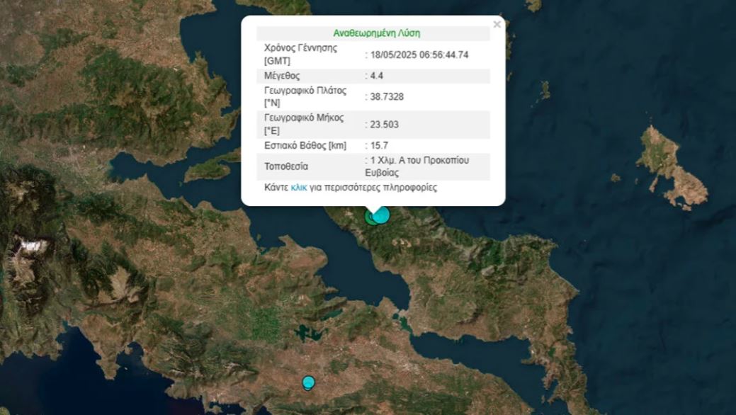 Σεισμός 4,4 Ρίχτερ σημειώθηκε στην Εύβοια, σήμερα το πρωί. Σύμφωνα με το Γεωδυναμικό Ινστιτούτο Αθηνών, το επίκεντρο του σεισμού εντοπίζεται 1 χιλιόμετρo ανατολικά του Προκοπίου Εύβοιας, ενώ το εστιακό βάθος εκτιμάται στα 15,7 χιλιόμετρα.