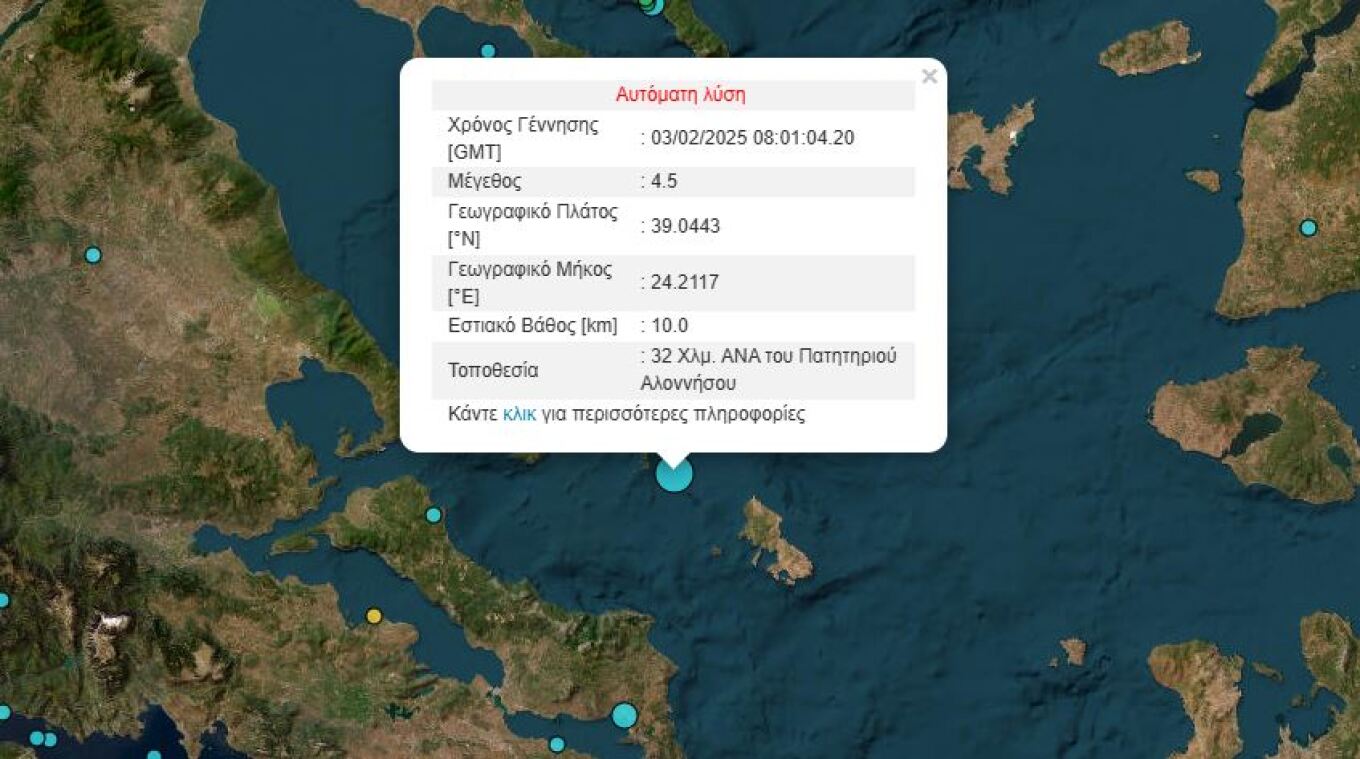 Σύμφωνα με την αυτόματη λύση του Γεωδυναμικού Ινστιτούτου ο σεισμός είχε επίκεντρο 32 χλμ. νότια-νοτιοανατολικά της Αλοννήσου.