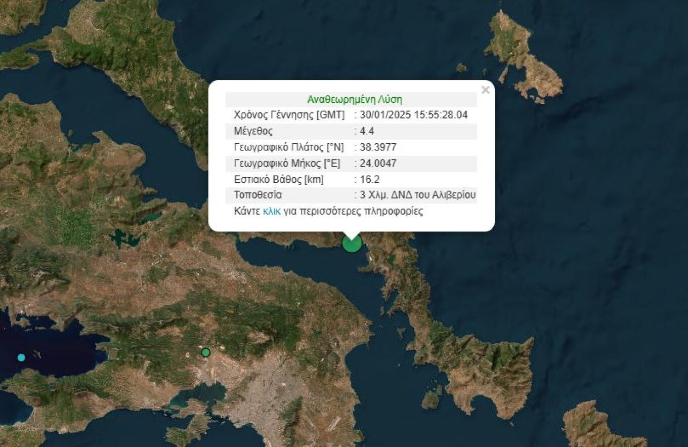 Σύμφωνα με την τελευταία αναφορά του Γεωδυναμικού Ινστιτούτου, ο σεισμός είχε επίκεντρο την περιοχή του Αλιβερίου -3 χλμ. δυτικά- στην Εύβοια και ήταν εντάσεως 4,4 βαθμών της κλίμακας Ρίχτερ, με εστιακό βάθος 16,2 χιλιόμετρα.