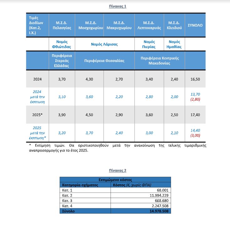 2,8 ευρώ για το 2024, καθώς η επιβάρυνση της διέλευσης από τους πέντε σταθμούς μειώνεται από 16,5 (σήμερα) σε 13,7 ευρώ, και 3 ευρώ για το 2025, από 17,4 σε 14,4 ευρώ.