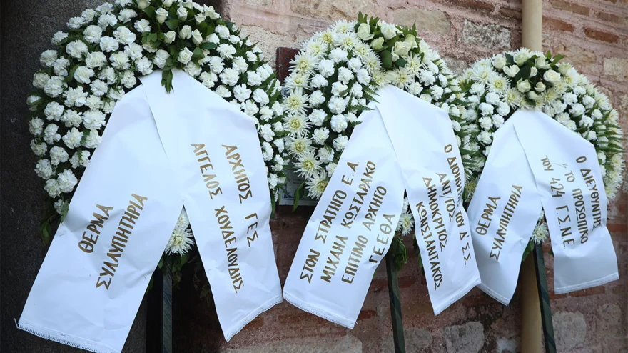 «Αρχηγέ καλό ταξίδι», γράφουν μερικά από τα δεκάδες στεφάνια που έχουν κατακλύσει τον ναό, ενώ στην είσοδό του υπάρχει το στεφάνι της συζύγου του.
