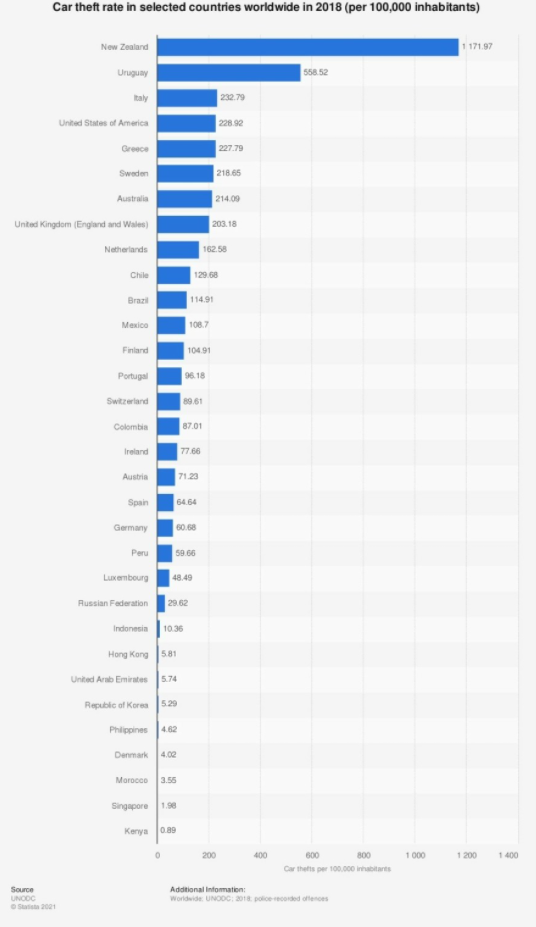 Η Κένυα και η Σιγκαπούρη είναι οι πιο «ασφαλείς» χώρες για να κατέχει κανείς αυτοκίνητο καθώς έχουν εξαιρετικά χαμηλά ποσοστά κλοπών με την Κένυα να καταγράφει 0,8 και την Σιγκαπούρη μόλις 1,9 κλοπές ανά 100.000 κατοίκους. Τα στοιχεία που δημοσιοποίησε η Statista αφορούν στο 2018.