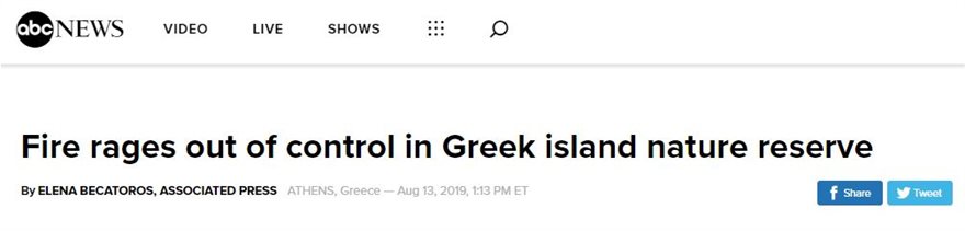 Σε δημοσίευμα που φέρει τον τίτλο «φωτιά μαίνεται ανεξέλεγκτη σε φυσικό καταφύγιο ελληνικού νησιού», το αμερικανικό ABC News με τη σειρά του αναφέρεται στους παράγοντες που συνέβαλαν στην ταχεία εξάπλωση της φωτιάς, παραθέτοντας παράλληλα μαρτυρίες από κατοίκους των χωριών που εκκενώθηκαν.