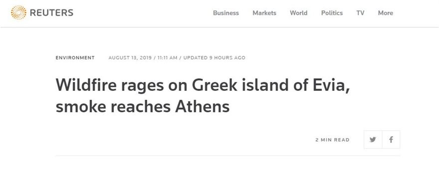 «Μια πυρκαγιά ενισχυμένη από δυνατούς ανέμους έκαψε μεγάλες εκτάσεις πευκοδάσους στο ελληνικό νησί την Τρίτη, με αποτέλεσμα να εκκενωθούν χωριά και οι Αρχές να ζητήσουν βοήθεια από τους Ευρωπαίους εταίρους τους», αναφέρει το πρακτορείο, επισημαίνοντας ότι ο Έλληνας πρωθυπουργός διέκοψε τις διακοπές του στην Κρήτη και επέστρεψε εσπευσμένα στην Αθήνα προκειμένου να ενημερώνεται από κοντά για την πορεία της κατάσβεσης.