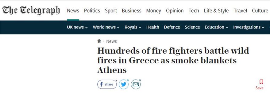 Από τη μεριά της, η βρετανική Telegraph αναφέρεται όχι μόνο στην πυρκαγιά στην Εύβοια, αλλά και στις εστίες στη Θάσο και στη Θήβα που προκάλεσαν εχθές κινητοποίηση στην Πυροσβεστική. Το σχετικό δημοσίευμα επισημαίνει ότι η φωτιά στην Εύβοια ξέσπασε σε ένα πυκνό πευκοδάσος, που αποτελεί καταφύγιο άγριας ζωής, και ότι στη συγκεκριμένη περιοχή η πρόσβαση μέσω ξηράς είναι δύσκολη.