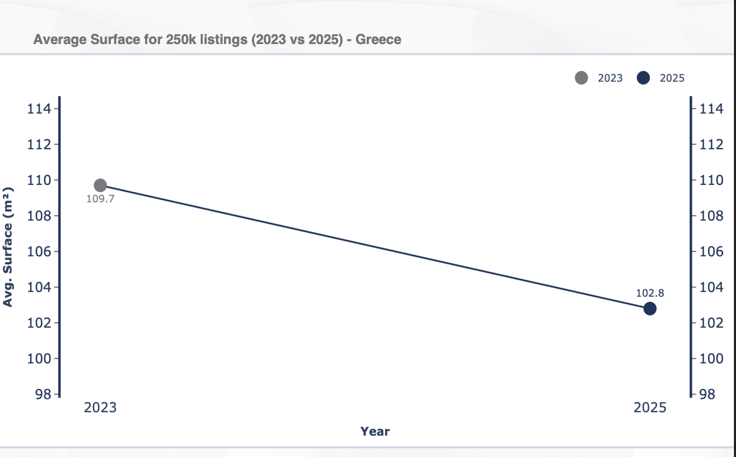 Σε σχέση με το 2023, αν κάποιος διέθετε τότε και τώρα ένα κεφάλαιο 250.000 ευρώ το σπίτι που θα αγόραζε σήμερα θα ήταν μικρότερο κατά 6,9 τετραγωνικά μέτρα, κατά μέσο όρο, όπως προκύπτει από την επεξεργασία των αγγελιών πανελλαδικά. Από τα 109,7 τ.μ. του 2023 η επιφάνεια των τ.μ. έχει μεταβληθεί σήμερα στα 102,8 τ.μ. με την εικόνα φυσικά να αλλάζει ανάλογα με την περιοχή.