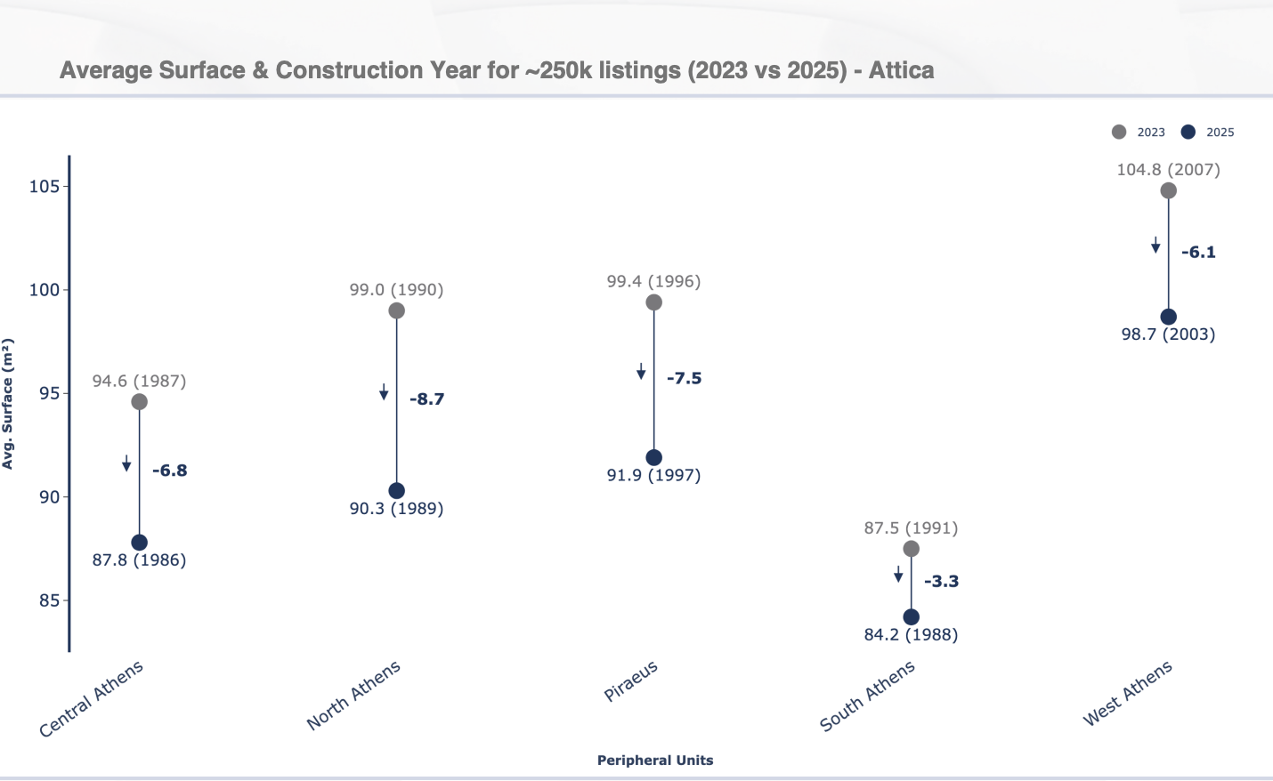 Ανά περιοχή και ξεκινώντας από την Αττική, η μέση απώλεια την περίοδο 2023- 2025 φτάνει τα 6,5 τ.μ. για το ίδιο budget των 250.000 ευρώ, με τις μεγαλύτερες πιέσεις, όπως είναι εύλογο στα νότια προάστια και το κέντρο της Αθήνας, τόσο από πλευράς επιφάνειας διαμερισμάτων όσο και (μεγαλύτερης) παλαιότητας στα σπίτια, ενώ για νεόδμητα …ούτε λόγος.