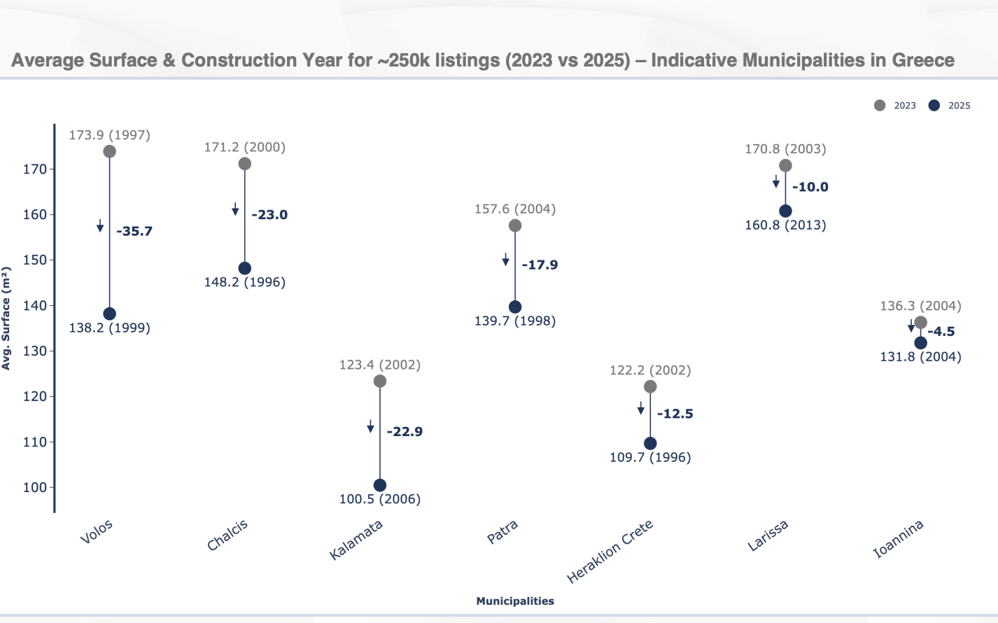 Ανάλογη εικόνα καταγράφεται και σε άλλες αγορές της Περιφέρειας και μάλιστα πολύ πιο έντονα από την Αθήνα, με δεδομένη τη γενικευμένη πλέον άνοδο της αγοράς εκτός της πρωτεύουσας. Στο Βόλο, η απώλεια σε επιφάνεια φτάνει τα 35,7 τ.μ. (από τα 173,9 τ.μ. για σπίτι του 1997 το 2023 σε 138,2 τ.μ. για σπίτι του 1999 σήμερα), ενώ σημαντικές μειώσεις εμφανίζονται και σε άλλες μεγάλες πόλεις: Στη Χαλκίδα, η ψαλίδα είναι στα 23 τ.μ., στην Καλαμάτα 22,9 τ.μ., στην Πάτρα 17,9 τ.μ., στο Ηράκλειο στα 12,5 τ.μ. κ.ο.κ.