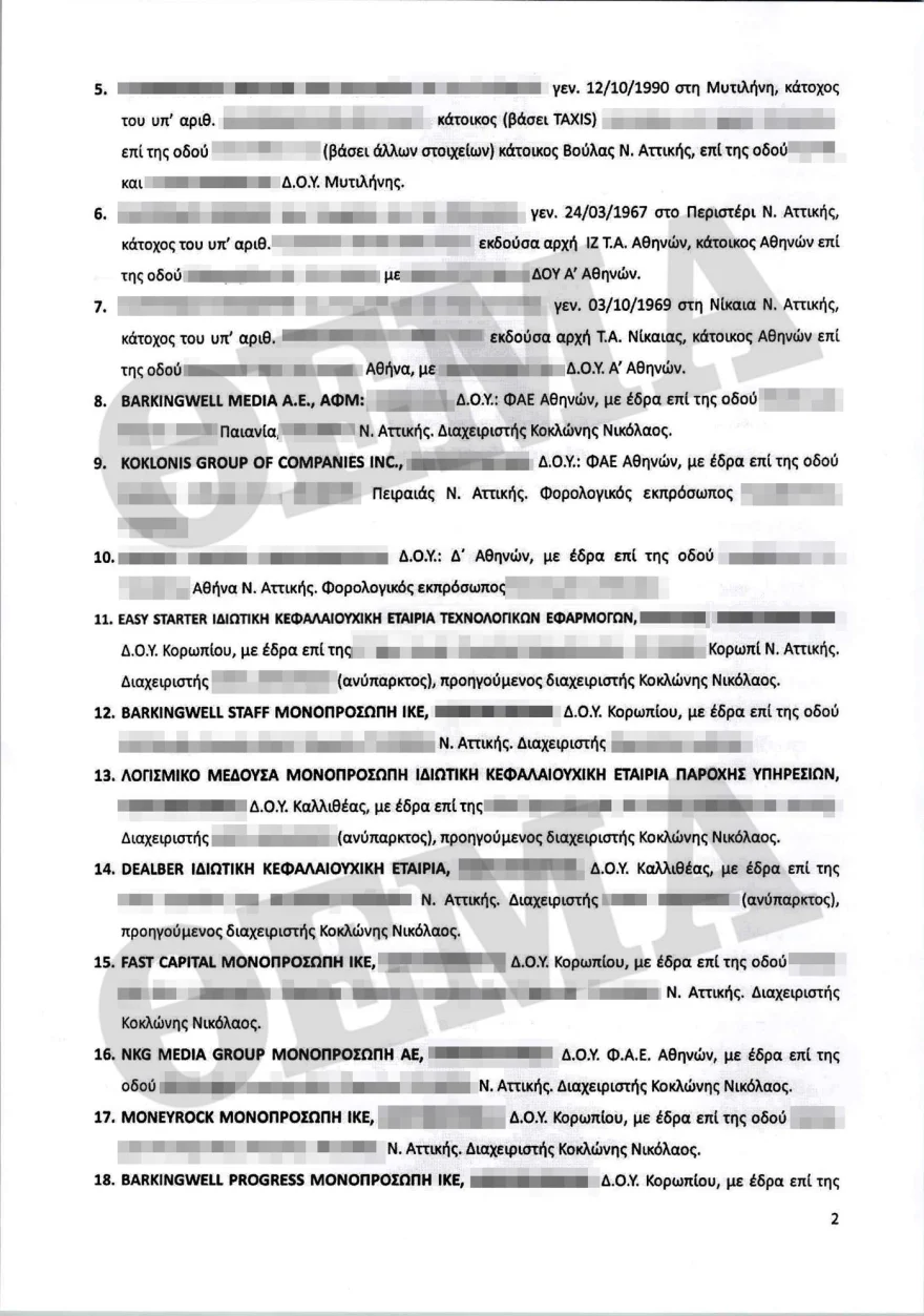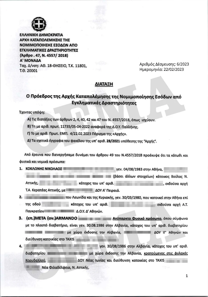 Δείτε όλη τη διάταξη της Αρχής Καταπολέμησης Εσόδων από Εγκληματικές Δραστηριότητες για την υπόθεση Κοκλώνη: