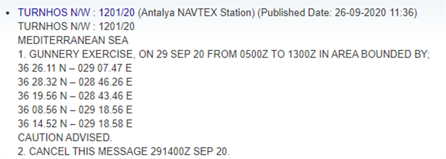 ΕΛΛΑΔΑ Τουρκία: Νέα NAVTEX για άσκηση μεταξύ Ρόδου και Καστελόριζου Ανακοίνωσε άσκηση με πραγματικά πυρά στις 29 Σεπτεμβρίου NEWSROOM 26 ΣΕΠΤΕΜΒΡΙΟΥ 2020 - 16:23 0 Νέα ΝAVTEX για άσκηση με πραγματικά πυρά εξέδωσε η Τουρκία, δεσμεύοντας περιοχή μεταξύ της Ρόδου και του Καστελόριζου στις 29 Σεπτεμβρίου από τις 8:00 έως τις 4:00. Η NAVTEX στον υδρογραφικό σταθμό της Αττάλλειας: Πηγή: www.protothema.gr Σχολίασε εδώ Για να σχολιάσεις, χρησιμοποίησε ένα ψευδώνυμο.