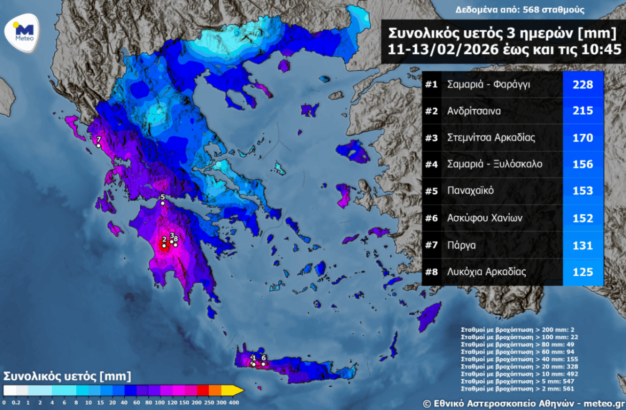 Σημαντικά ύψη βροχής καταγράφηκαν σε πολλές περιοχές της χώρας το τριήμερο 11 με 13 Φεβρουαρίου 2026, λόγω διαδοχικών βαρομετρικών χαμηλών.