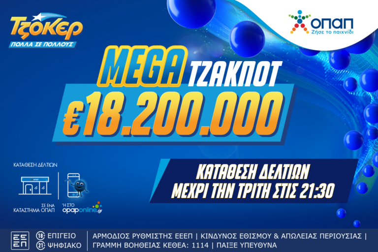 Μετά από 32 συνεχόμενα τζακ ποτ, το ΤΖΟΚΕΡ μοιράζει απόψε τουλάχιστον 18,2 εκατ. ευρώ στους νικητές της πρώτης κατηγορίας. Η κλήρωση για το έπαθλο ρεκόρ θα διεξαχθεί στις 22:00, με τις συμμετοχές να ολοκληρώνονται μισή ώρα νωρίτερα, στις 21:30. Όσοι επιθυμούν να διεκδικήσουν τα 18,2 εκατ. ευρώ μπορούν να καταθέτουν τα δελτία τους στα καταστήματα ΟΠΑΠ όλης της χώρας, καθώς και διαδικτυακά στο opaponline.gr.