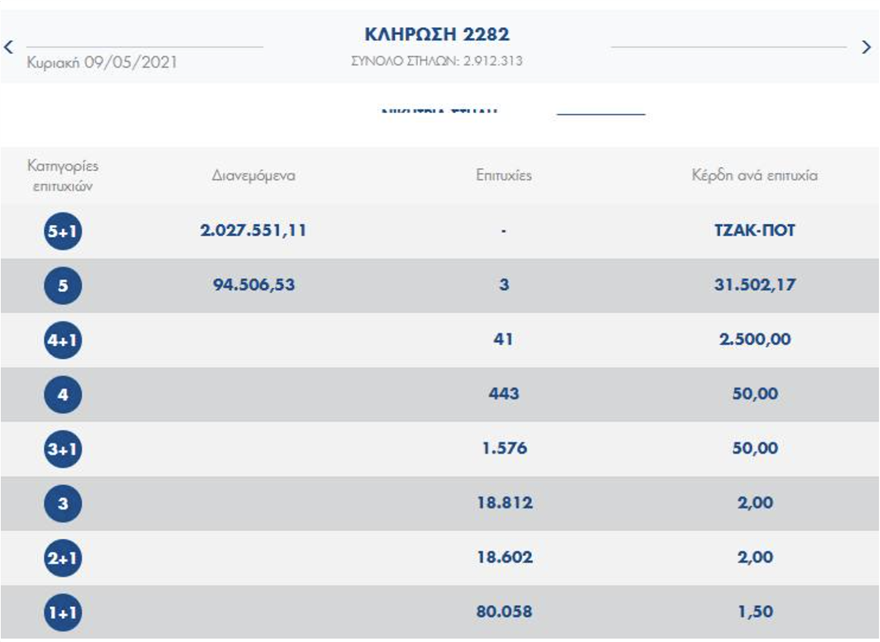 Το τζακ ποτ σημειώθηκε στην κλήρωση του Τζόκερ (2282), κατά την οποία το τυχερό παιχνίδι του ΟΠΑΠ μοίραζε πάνω από 2.027.000 ευρώ.