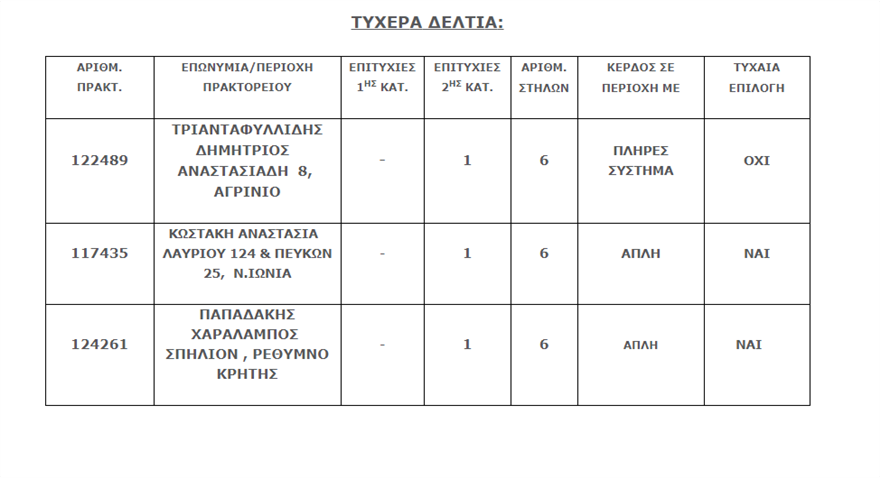 Επίσης, στη δεύτερη κατηγορία (5άρια) βρέθηκαν τρεις επιτυχίες, οι οποίες κερδίζουν το ποσό των 31.502,17 ευρώ έκαστη.