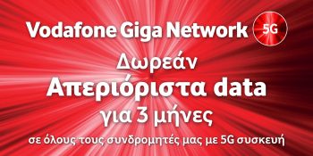 H Vodafone Ελλάδας ανακοινώνει ότι διαθέτει από σήμερα Δευτέρα 11 Ιανουαρίου 2021 δωρεάν απεριόριστα data για 3 μήνες σε όλους τους συνδρομητές της που διαθέτουν 5G συσκευή, ώστε να ζήσουν την εμπειρία του Vodafone Giga Network 5G.