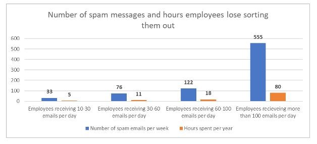 Σύμφωνα με τους υπολογισμούς, όσοι λαμβάνουν έως και 30 email την ημέρα δέχονται επίσης περίπου 30 spam μηνύματα την εβδομάδα και δαπανούν συνολικά περίπου πέντε ώρες κάθε χρόνο για την ταξινόμησή τους. Οι εργαζόμενοι που λαμβάνουν 30 με 60 email κάθε μέρα περνούν 11 ώρες τον χρόνο κάνοντας το ίδιο πράγμα, γεγονός που ισούται με περισσότερο από μία εργάσιμη ημέρα. Και όσοι λαμβάνουν έως και 100 email καθημερινά μπορούν να περάσουν 18 ώρες τακτοποιώντας τα – δηλαδή περισσότερες από δύο εργάσιμες ημέρες τον χρόνο. Για email που λαμβάνουν περισσότερα από 100 εισερχόμενα μηνύματα ανά ημέρα, ο αριθμός των ωρών που απαιτούνται για την ταξινόμηση των spam email ισούται με 80 ανά έτος. Αλλά το γεγονός αυτό θα μπορούσε να αφορά τη γενική κατηγορία εισερχομένων, τα οποία συνήθως δεν καθαρίζονται.